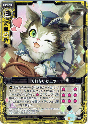 猫ふんじゃった | 费用 | 力量 | 标记 | 1 | - | - | | 【★】选择方阵上的你的1张[猫妖精],将其破坏。破坏了的话,选择方阵上的1张你的卡名含有「奥利哈钢暴龙」的Z/X,将其重启。 | | 「猫咪真让人火大!绝对要比那个大胸女更先一步抓住你好好惩罚!踩扁它,暴龙!」「快、快跑喵!」四处逃窜的缅因猫被暴龙踩扁了。「喵啊~!」「抓住你了!快点把世罗的妈妈还回来!」 | 反映了《英雄们的战记》第5章第4话「踩扁猫咪 - Ne-Co Fun Jitter -」的卡片。