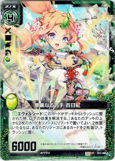 S級整備士ヒンデンブルク | 费用 | 力量 | 标记 | 4 | 6000 | - | 【自】进化原力(这张卡登场时,你可以选择你的废弃区中的1张卡,以正面表示放置到这张卡下方作为原力素材。)