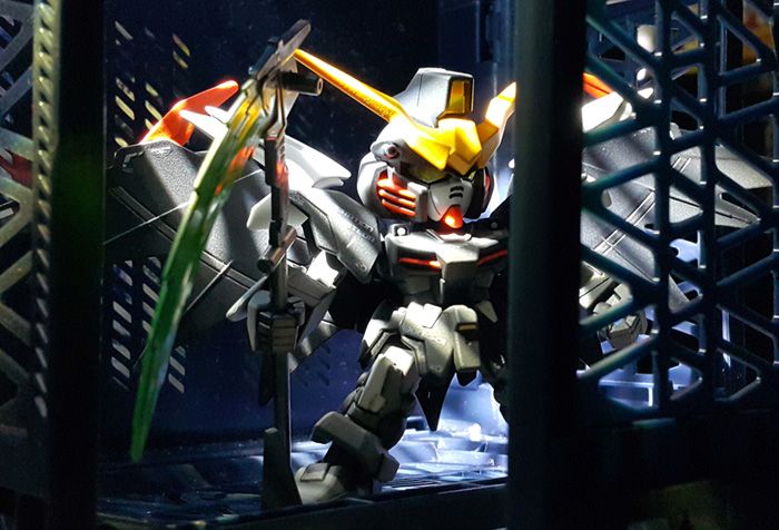 - 雙眼和監視器貼上LUNAGAZER GUNDAM剩下的鐳射貼紙,不同角度下顏色有所變化