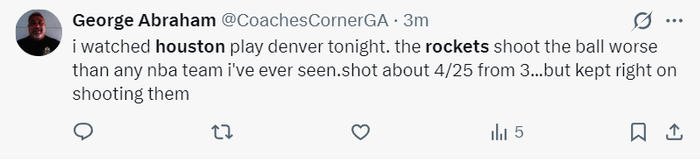 这场比赛火箭的惨败让很多记者、媒体对这支球队的前途产生了质疑,美记:我全程观看了这场比赛,火箭的投篮表现是我见过任何一支NBA球队最差的,他们三分球25中4后还在不停出手三分打铁。